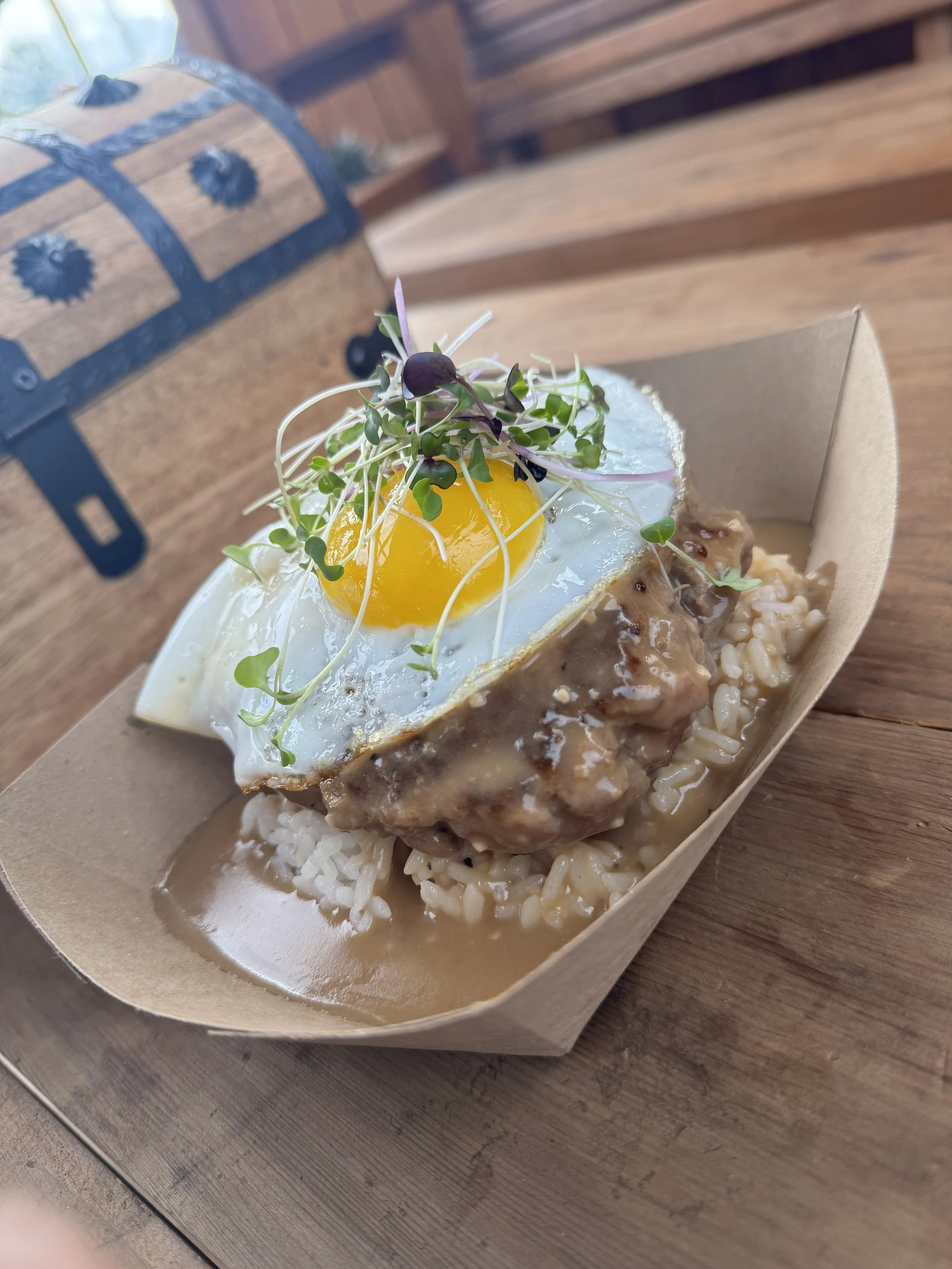 Pure Aloha comfort on a plate! Fluffy rice topped with a juicy beef patty, drenched in our rich Housemade brown gravy and crowned with an egg cooked your way.