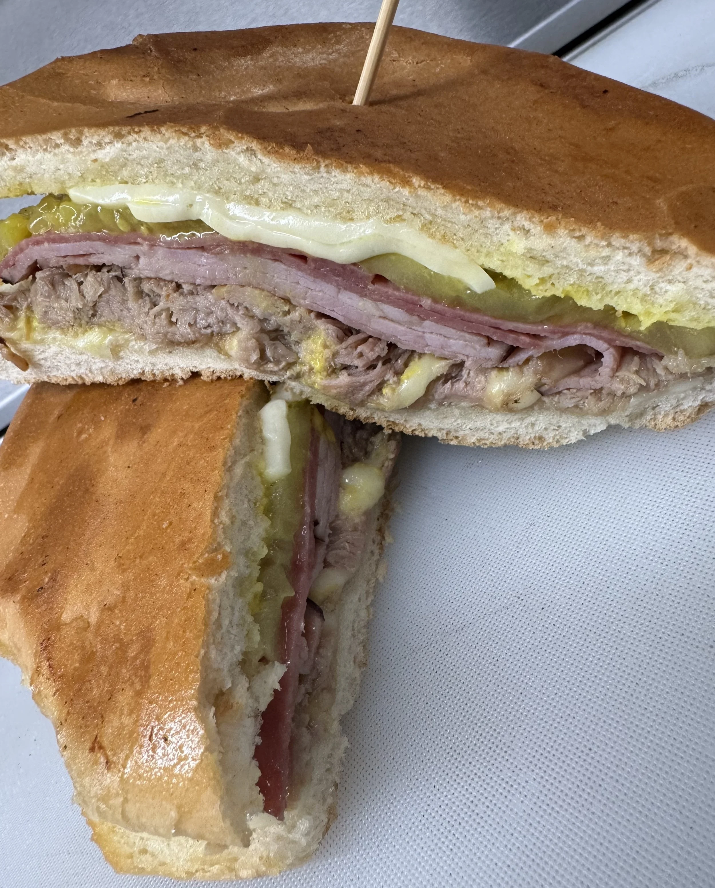 One of the chef's favorite sandwiches, made to perfection. Our locally-sourced Telera bread is toasted with butter, thin sliced salami, Smokey Kalua pork, juicy ham are all heated on the griddle and topped with provolone, this juicy melty stack is placed on the bread and finished with pickles and mustard.