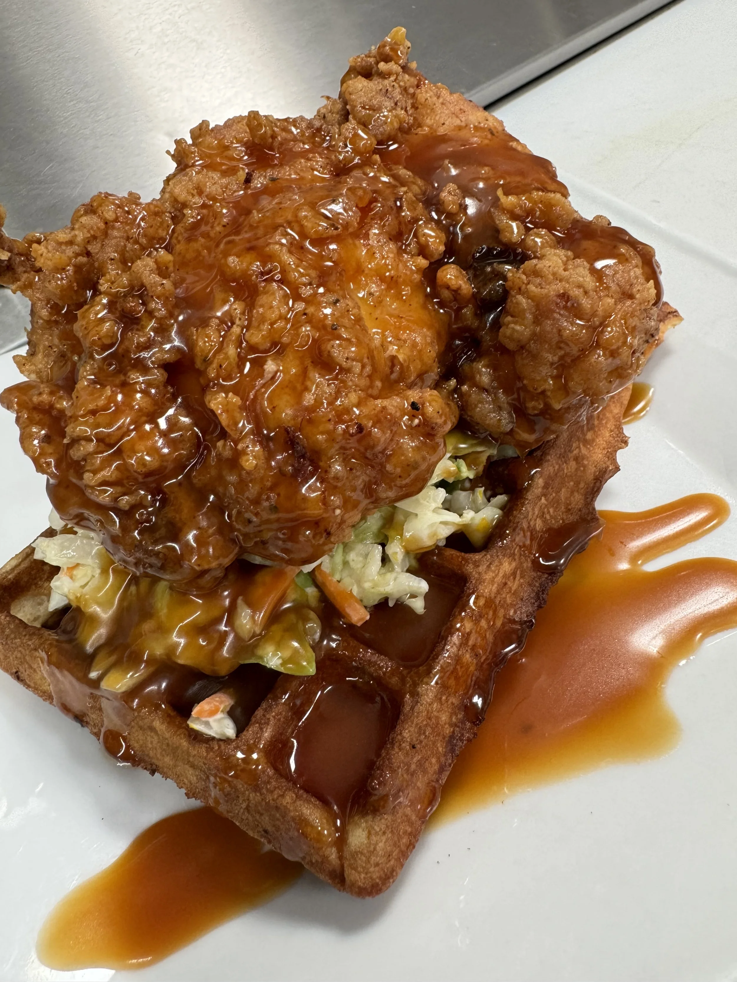 Chicken and waffles oh my ! House fried chicken, fresh fluffy waffle, our citrus Serrano slaw, topped with a honey maple bourbon syrup. This is just good!