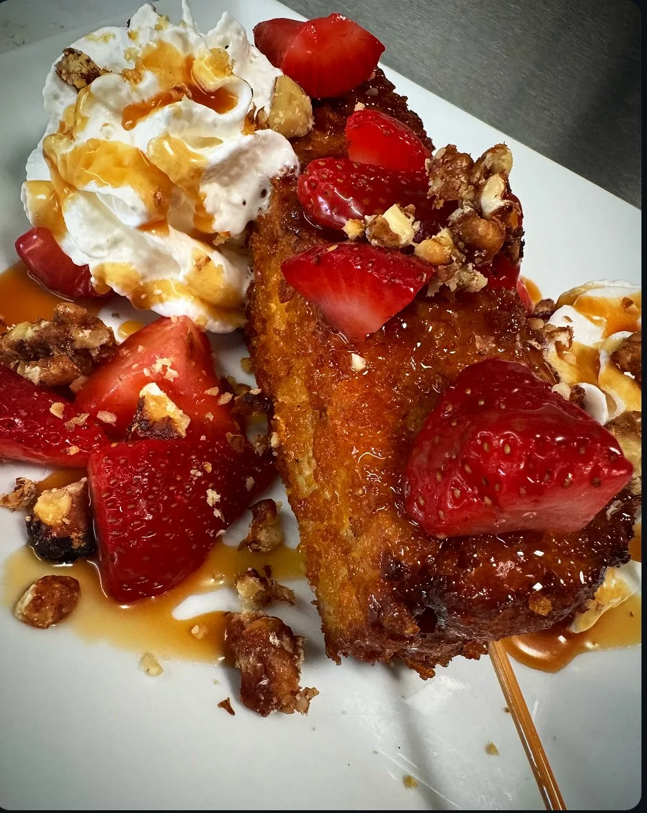 It's 5 o'clock somewhere! A skewer of house made bread pudding rolled in egg wash and cornflakes then fried, topped with seasonal fruit, drizzled with house-made Carmel bourbon sauce and sprinkled with Candied walnuts. This is the perfect go-to for treating yourself!