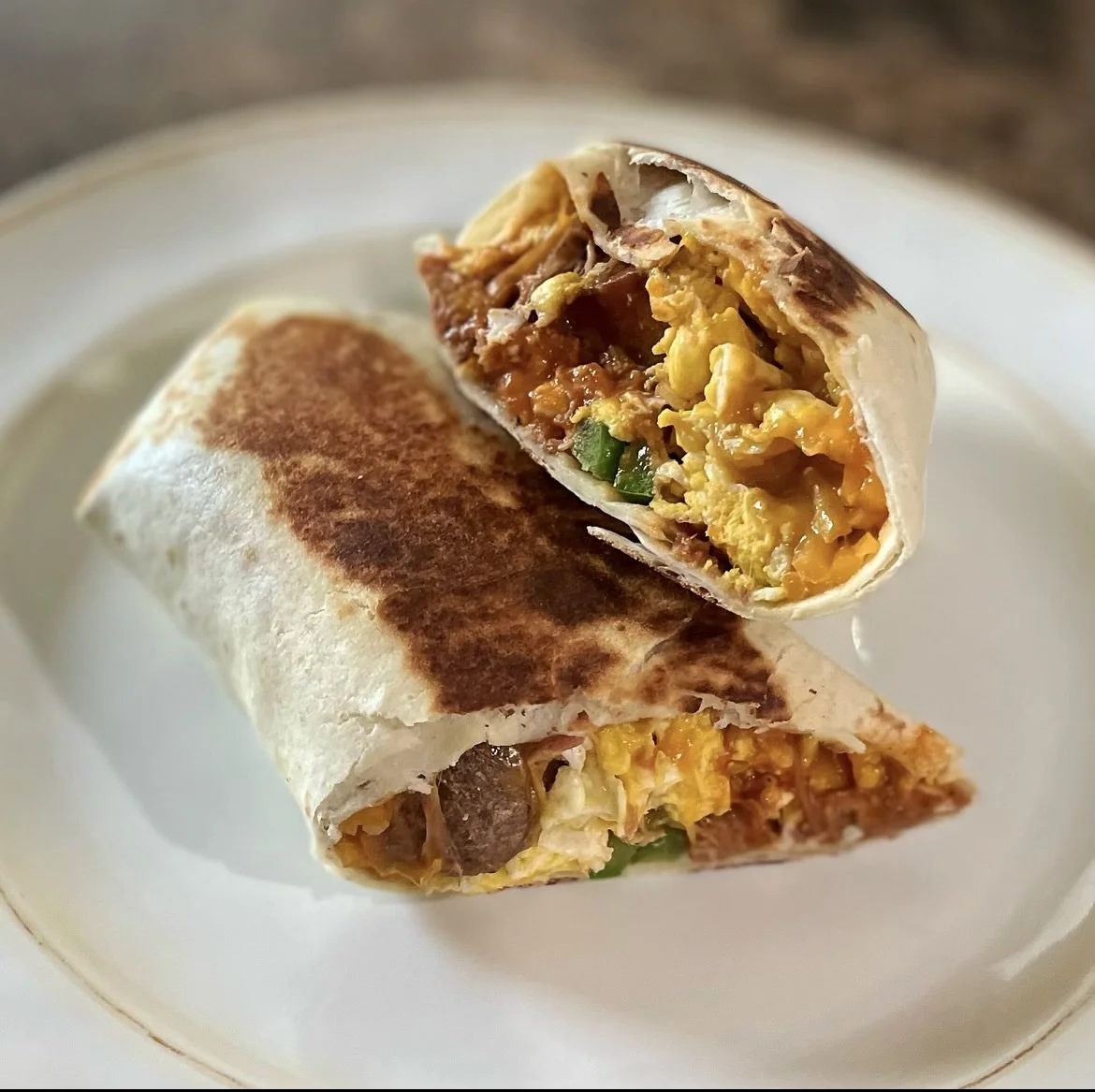 Giving you a reason to get out of bed for the days you're questioning how badly you need your job. A flour tortilla stuffed with crispy roasted fingerling potatoes, fluffy scrambled eggs, cojita cheese, bell peppers, caramelized onion, pork, and topped with our whackomole sauce.